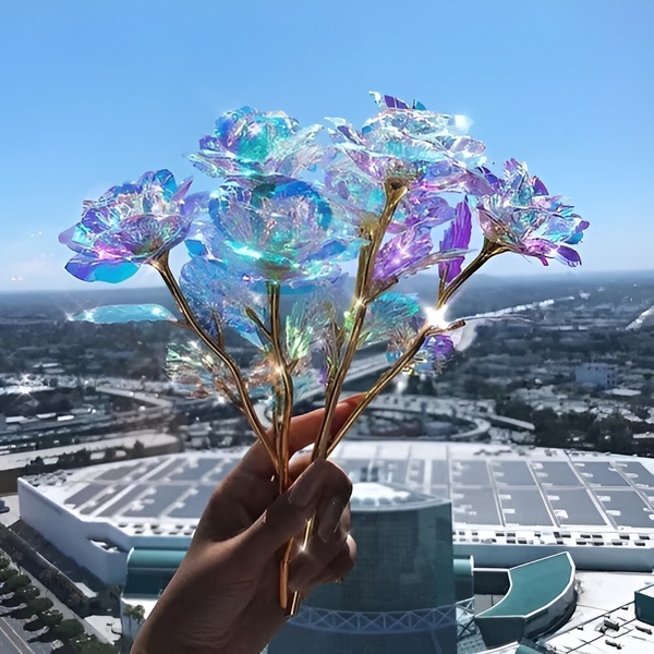 Κάθε τριαντάφυλλο είναι κατασκευασμένο με μια ιριδίζουσα, ολογραφική επίστρωση που λαμπυρίζει υπέροχα στο φως, δημιουργώντας μια λάμψη που μοιάζει με γαλαξία και είναι απλά μαγευτική.
