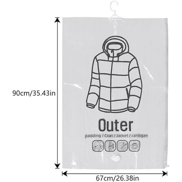 Μεγιστοποιήστε το χώρο της ντουλάπας σας διατηρώντας την οργανωμένη σε όλες τις εποχές. Χρησιμοποιήστε αυτές τις κρεμαστές συμπιεζόμενες σακούλες αποθήκευσης για την αποθήκευση μεγάλων, ογκωδών ή ξεπερασμένων κοστουμιών, φορεμάτων, χοντρών γιλέκων, σακακιών και παλτών στην ντουλάπα σας. Οι σφραγισμένες σε κενό αέρος σακούλες αποθήκευσης προστατεύουν τα ρούχα σας από το νερό και τις οσμές, καθιστώντας τις ιδανικές για μακροχρόνια χρήση.