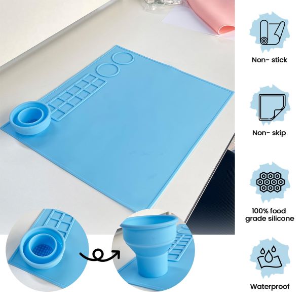 Κατασκευασμένο από 100% σιλικόνη ποιότητας τροφίμων, αυτό το αδιάβροχο, αντικολλητικό και αντιολισθητικό χαλάκι είναι ιδανικό για όλες τις χειροτεχνικές σας ανάγκες. Με 14 θήκες και μια περιοχή ανάμειξης, είναι ιδανικό για την οργάνωση των προμηθειών σας.